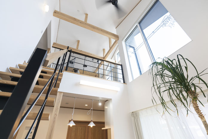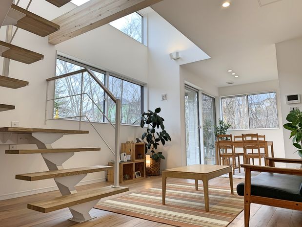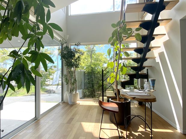 南面にオープン階段や大きな窓をデザインするのがアオバクラフトの太陽の設計の最大の特徴だ。太陽は東から昇って西に沈む、そして夏の高度は高くて冬は低い。「当たり前のことに素直なだけです」とスタッフは笑う。太陽のエネルギーは大きな窓1か所で600Wのファンヒーター1台分になる。夏は遮って冬は取り込む。心地よい暮らしは“陽”加減で叶いますとスタッフは自信を持つ。冷暖房効率のよさをぜひモデルハウスで体感してみては