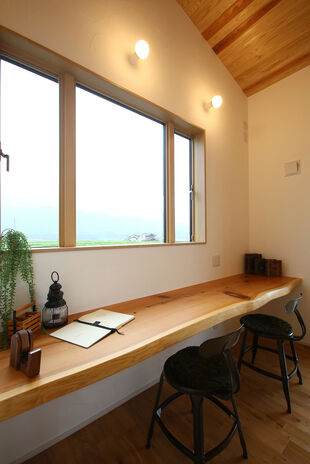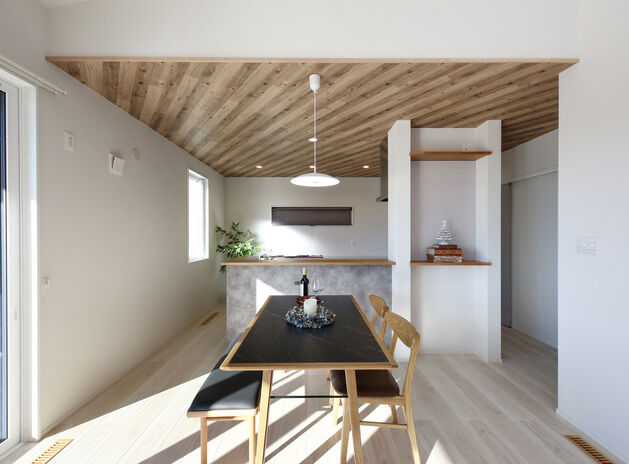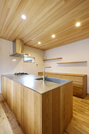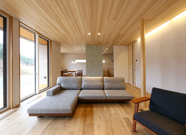 地域密着型住宅ブランド「弦」では自然素材をふんだんに使った家づくりにも対応。同社は素材選定からこだわっており、例えば柱一つとっても芯持ちの無垢材で樹の種類に応じた含水率とヤング係数を定め、全数検査で基準をクリアしたもののみしか採用しない徹底ぶり。室内の床や天井、キッチンや収納といった住宅設備においても希望に沿って自然素材を取り入れてくれるのでぜひご相談を。