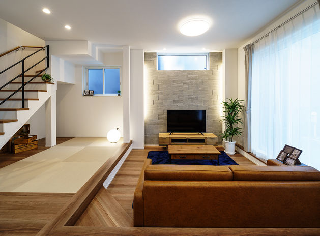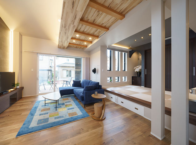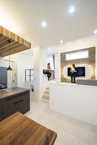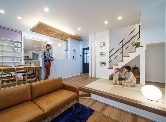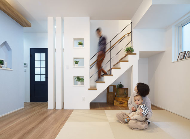 親子がたくさんふれあえる間取りや、親子が安心して過ごせる室内環境も、子育てしやすい家の条件と考える吉川建築。「できるだけ健やかな環境を整えたい」という想いから、「抗酸化工法」を採用した健康住宅を提案。家の中の素材は、ホルムアルデヒドなどの化学物質は基本的に不使用。一歩入っただけで「空気がきれい」とわかるほど新鮮な空気に子どもも笑顔。タタミスペースやスキップフロアなど、ワクワクする空間も相談して。