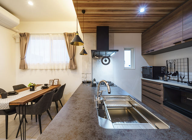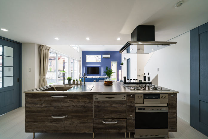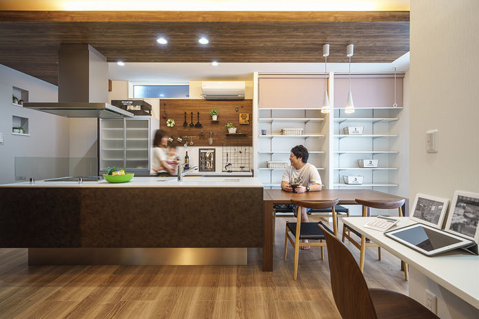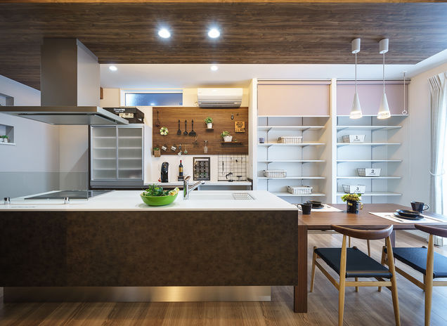 吉川建築では毎日のスムーズな生活動線と、家族がふれ合いやすい間取りを常に意識して設計。特にキッチンは作業のしやすさと動き回りやすいことが大事なため、背後に水回りへの通り道を作ったり、サンルームなどの家事室を洗面所に隣接させたりと、実際の生活をイメージしながら提案する。さらに収納の充実も家事ラクのポイント。造作の棚や収納スペースも多く設け、片付けやすくてすっきりと暮らせる住まいに。