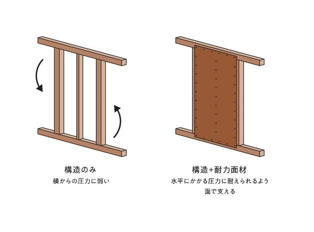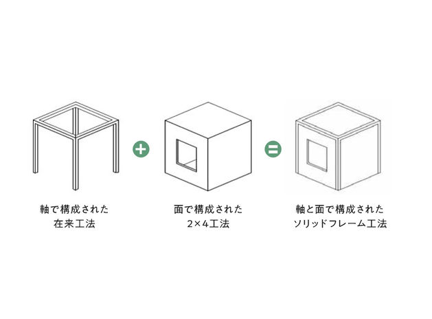 エクセレントホームは、在来工法と2×4工法のいいところをミックスしたソリッドフレーム工法を採用。軸で支える構造に加えて、耐力面材を採用。柱・梁・土台を一本化することで、台風や地震の力を建物全体で受け止めて高い耐震性能を発揮。さらに全棟設計性能評価を取得し、許容応力度計算による構造計算を実施している。