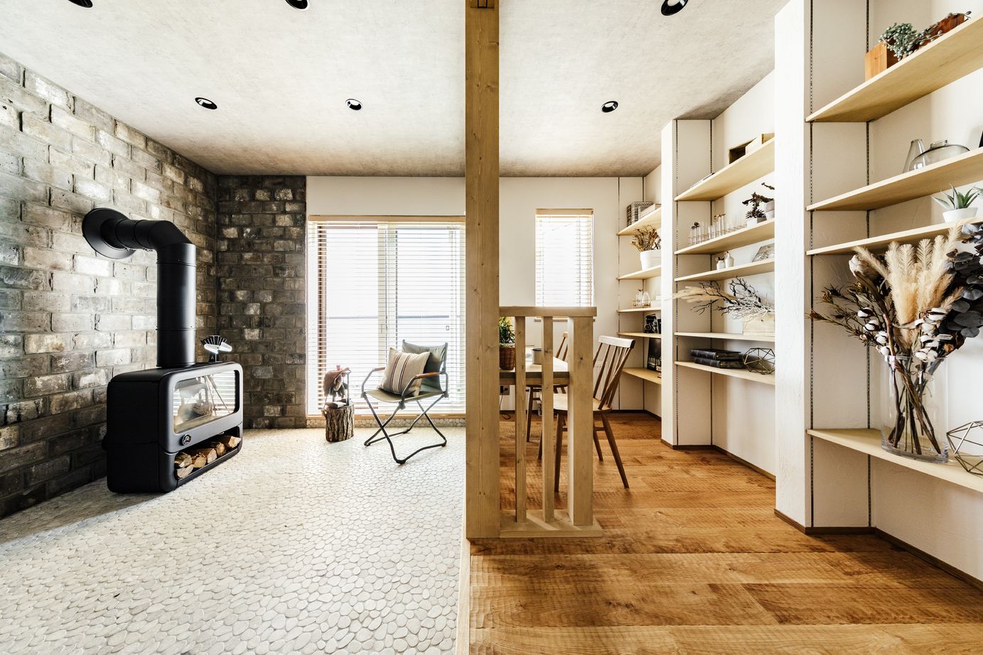 暖かさが自慢のナチュリエ新潟の家。おうち時間が多くなっている今の時代に、快適に過ごすため、高い基準の気密性・断熱性の家づくりに。木の風合いや薪ストーブを設置し身も心も暖かさが感じることができる。新潟の寒い冬にはぴったりの家づくりになっている。