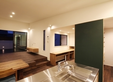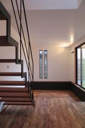 スキップフロアが印象的な家。1.5階を作って高窓を配置する事で、中からは見えますが、太陽光の反射で公園から見えないよう工夫しています。スキップフロアは造作階段とルーバーで立体感を演出、下は大規模な床下収納です。お施主様お気に入りのレンガ風タイルは、目に入りやすいキッチン横の柱に採用しました