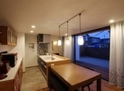 無垢のオリジナル玄関ドアを開けると、モルタル仕上げの土間が広がります。土間空間はLDK、和室、鉄骨階段すべてと繋がり、開放感のある楽しい間取りとなりました。お施主様ご自身でエイジング加工された木材でキッチンやバルコニーを作り、一味違ったライフスタイル空間に。シンクまでモルタルで仕上げた洗面台も見所です
