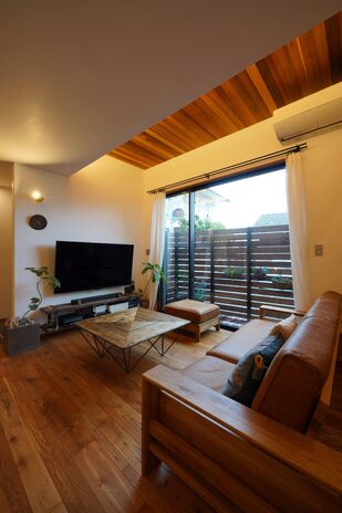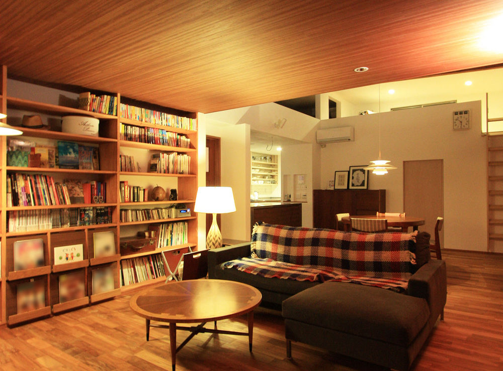 家の前に広がる池を借景に、吹抜けと高天井を組み合わせました。鉄骨のリビング階段で、そのまま吹抜けから2階へと繋がる開放感と絶好のビューはこの家の最大の見所。TVの背面に貼ったタイルに間接照明をあて、どこまでもかっこよさにこだわりました。キッチンはオリジナル、板張り天井や無垢床で北欧風にコーディネート