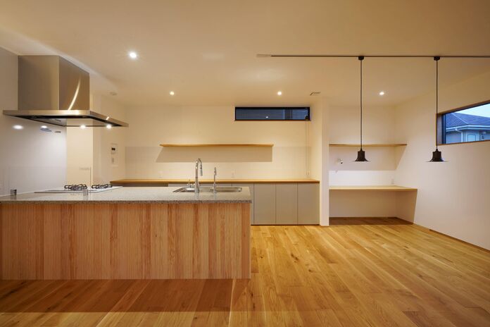 それぞれの家族の生活を守りながらも、二世帯が楽しく暮らせる明るい空間をご提案するハナハウス。写真のO様邸もご夫婦とお子様3人、祖父母が暮らす。様々な世代が窮屈でなく暮らせる空間の工夫は大前提、更にO様のデザインの憧れ、要望が隈なく形になったお宅だ。朝の忙しい時間にみんなで使える広々洗面や子供たちの大収納、子供たちと一緒に立てるキッチンの作業台など。気になる方は是非社名をクリックして実例をチェックして