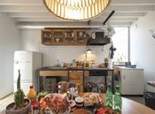 無垢オークと黒皮鉄脚の男前キッチン。そして、インダストリアル感のあるレンジフード、ここも施主のお気に入りポイント。キッチンの扉も、床と雰囲気を合わせたような仕様にできるのは驚いたそう。