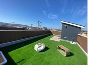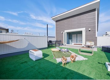 「屋上プライベートDOG GARDEN」は、愛犬の心と身体の健康を考える「GREEN DOG」 監修。床材は踏み心地の柔らかいゴムチップ舗装や人工芝を採用。屋上でもシャンプーを楽しめる設備や愛犬用ウォーターボウルなど、ペットと過ごす時間を満喫できるアイデアがいっぱい。ほかにも、ペットのための収納やプラスワンリビングバルコニーなど、家族とペットが楽しく暮らせる多彩なプランを提案している。