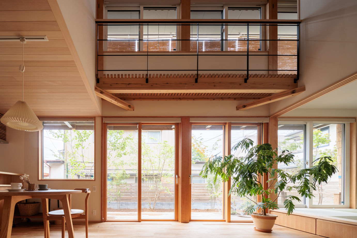 土地や季節によって変わる太陽の光や風の入り方を計算し、最適な位置と大きさで窓を配置。風が通る大きな吹抜けや土間からつながるLDK、上部に設けた明かり取りの小窓など自然の力を存分に取り込みつつ、エアコンなどの機械を最小限かつ効率的に活用できる家づくりには職人の技が光る。同社の家を手掛けるのはC値0.5cm2/m2以上の家を5棟以上経験している熟練職人のみ。きめ細かな施工を行うことで一層の快適さが生み出されるのだ。