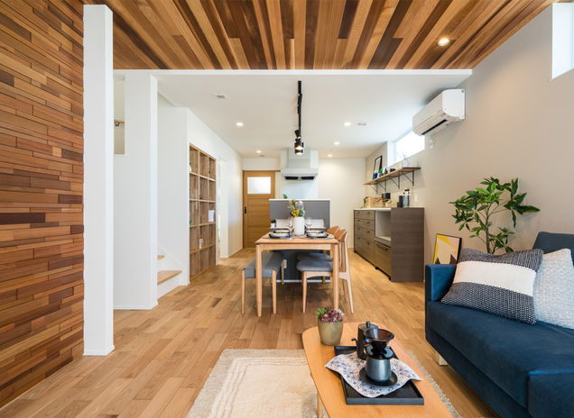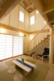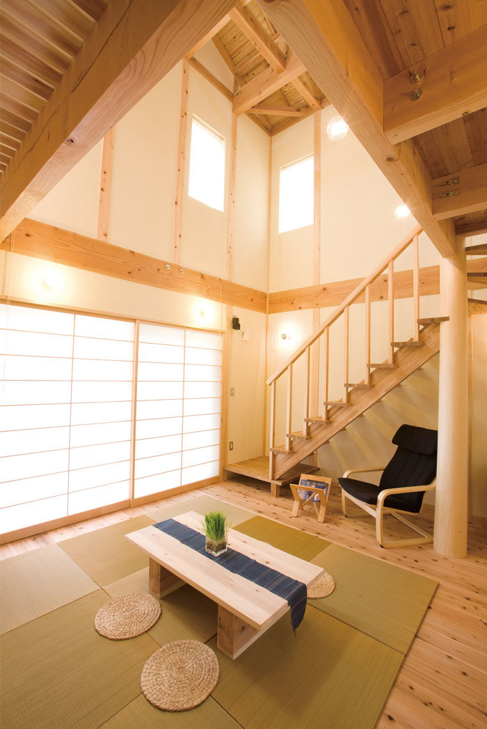 地元埼玉の「西川材」を中心に、自然素材を使った室内デザインをおこなう高砂建設。ナチュラルからスタイリッシュ、和風など様々なテイストのデザインに対応。さらに、西川材を使ったオリジナル家具や建具なども手掛けている。また、二重通気+外断熱のソーラーサーキット工法により、仕切りのない大空間や大きな吹抜けでも一年中快適に過ごせる空間を実現し、自由なプランニング、デザインを可能にしている。