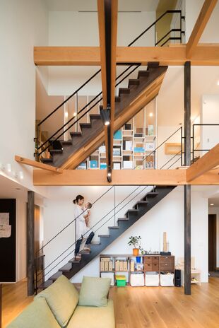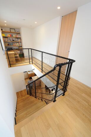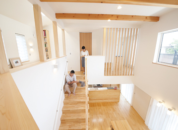 2階のホールは子どもの勉強スペース、スケルトン階段で、1階にいても子どもの気配が感じられる設計など、家族のプライバシーを考慮しながらも家族の気配を感じるあたたかな二世帯住宅をご提案。二世帯のご意見を丁寧にヒアリングさせていただき、ご家族にとって住み心地のよい間取りの提案をしている。