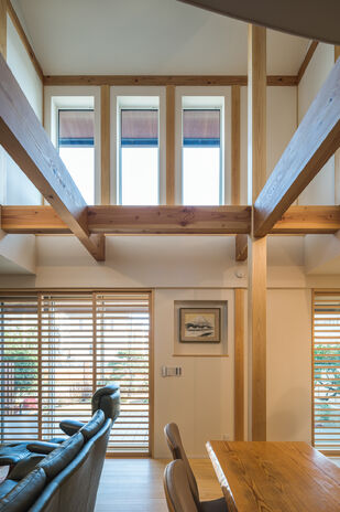 高砂建設ではまず土地の地盤調査を綿密に行い、必要な場合は適切な地盤改良を実施。基礎は通常のベタ基礎を上回る基礎配筋、耐圧盤、立ち上がりを標準とした耐圧ベタ基礎を用いて足元からしっかりと。構造材には地元で育ち、地元の気候風土で高い耐久性を発揮する西川材を用い、優れた強さを誇る木造軸組工法「たかさご耐震剛床システム」を駆使して高い耐震性を実現しながら大開口や大きな吹抜けも自由自在に叶う。