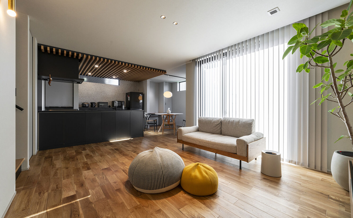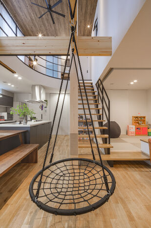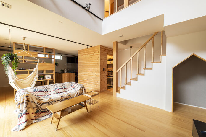 「将来の暮らしを見据えて、結婚前から土地探しと会社選びを始めていました」というMさん。家に関してはデザインはもちろん、高気密、高断熱、高耐震、省エネ性といった「性能の高さ」が必須条件だったそう。機械に頼りすぎるシステムよりも自然と調和するような家づくりに興味を持って高砂建設へ。「いくつかモデルハウスを見学して、自然素材と高い性能で実現した心地よい空気感を肌で感じることができました。特に気に入ったのは川口体感モデルハウス。スキップフロアを使った立体的な空間づくりがユニークで、ここはキッズスペース、ここは空中ヨガにぴったり…と自分たちの暮らしに当てはめてワクワクしました」と語っている。また、家事動線に配慮した間取りやコーディネートも参考になったそう。「性能とデザインが揃った家づくりは、私たちにとってまさに理想的でした」。