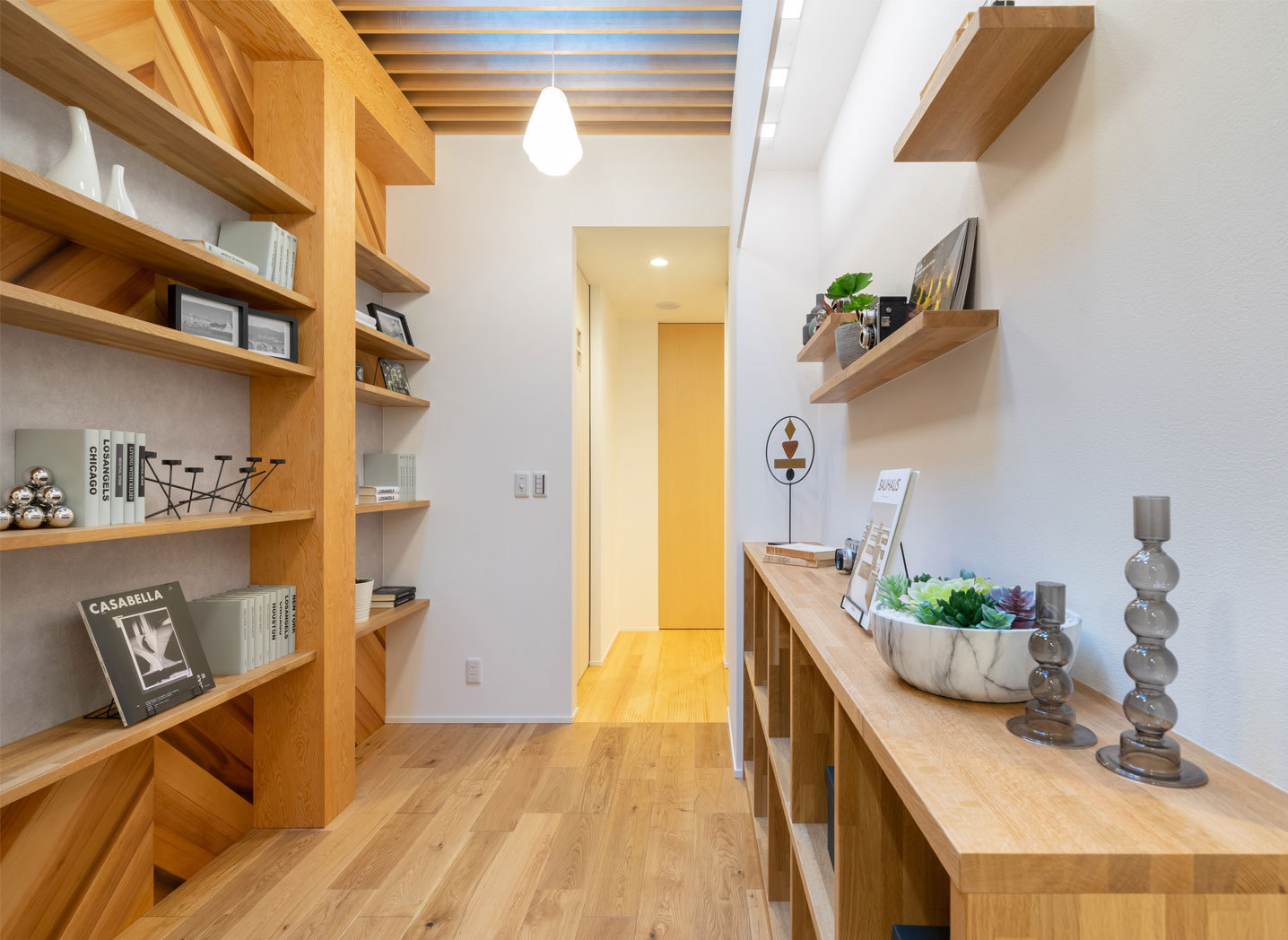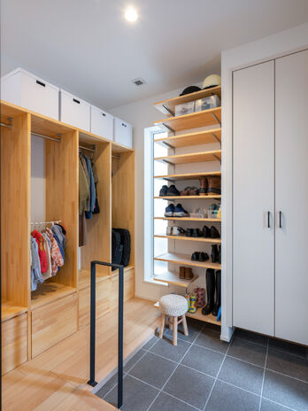 ライフスタイルと同様に収納スタイルも家族によってさまざま。大型収納にまとめる集約型でも、要所に必要なものを収める分散型でも家の中をすっきり見せたい目的は同じ。高砂建設では、さらに片付けやすい機能面や見せ方の工夫でスマートな暮らしを提案。得意の小屋裏で収納力を高めたり、職人の造作技術でデッドスペースを有効活用したりなど、豊富なアイデアとデザイン力、確かな技術で施主の期待を上回る充実の収納を実現する。