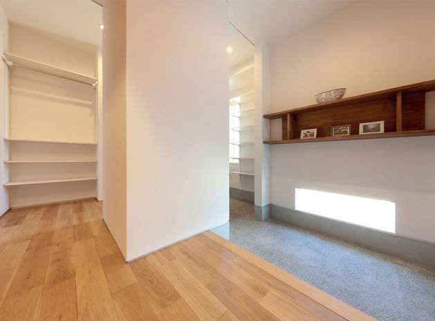 SICやパントリー、WICなどの大型収納にまとめたい“集約型”、使うものを使う場所に置く“分散型”、そして、両方を備えた“混合型”と収納計画は家族の習慣や物量によって大きく異なる。安田建設ではプラン作成時に綿密な打ち合わせを行い、ストレスなくキレイを保てる住まいを一緒に考えていく。扉付きで隠す、あえてオープンスタイルで見せるなどのスタイルにも工夫を凝らして、施主の好みと実用性を兼ね備えた収納を提案する。
