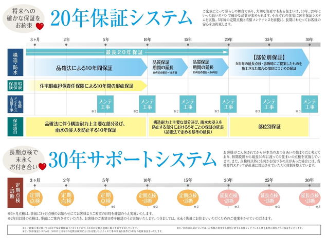 アフター:お住まいになってから定期点検20年間(延長保証による最長30年間)、保証:第三者機関による検査及び住宅瑕疵担保責任保険、同社規定によるアフター保証書の発行