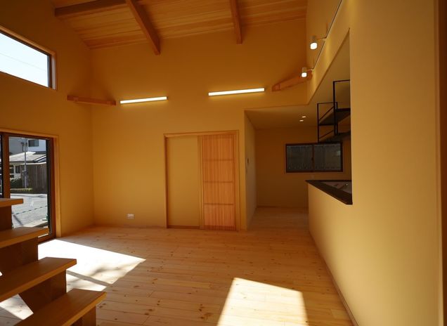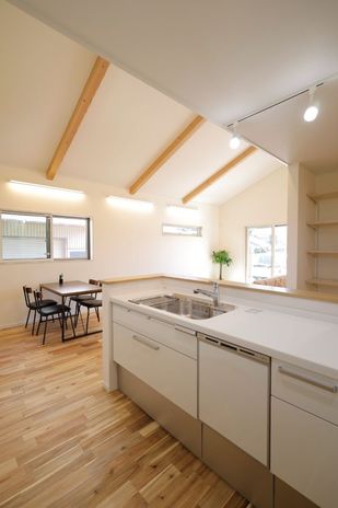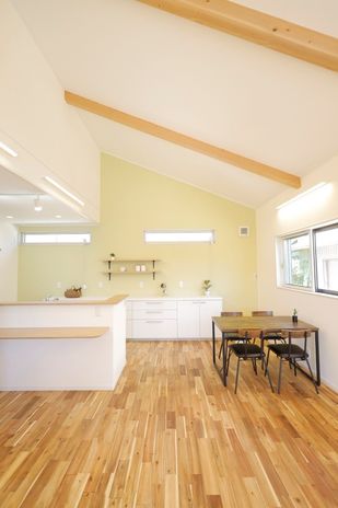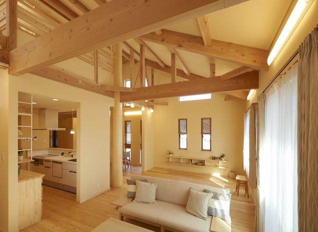 フラットな動線でつながる、シンプルでコンパクトな平屋が今、大人気。天然木と自然素材で建てる家づくりが得意なアサヒ開発には、そんなシンプルで心地いい平屋の実績が豊富。写真の施工事例にも、同社標準仕様の上質な天然木と自然素材がたっぷりと採用されている。木肌の美しさを活かした建具や造作家具がつくる、ぬくもりや力強さが感じられる空間が特徴。家の中を光が巡り、心地よい風が抜ける開放感も魅力だ。