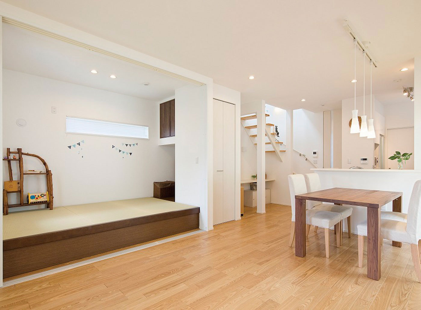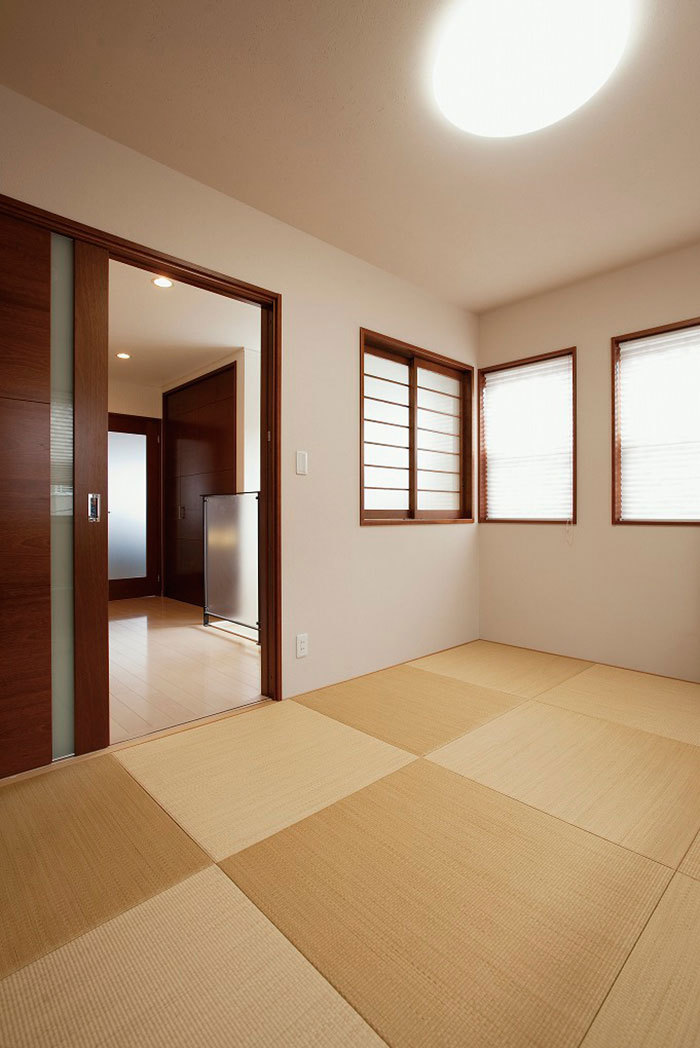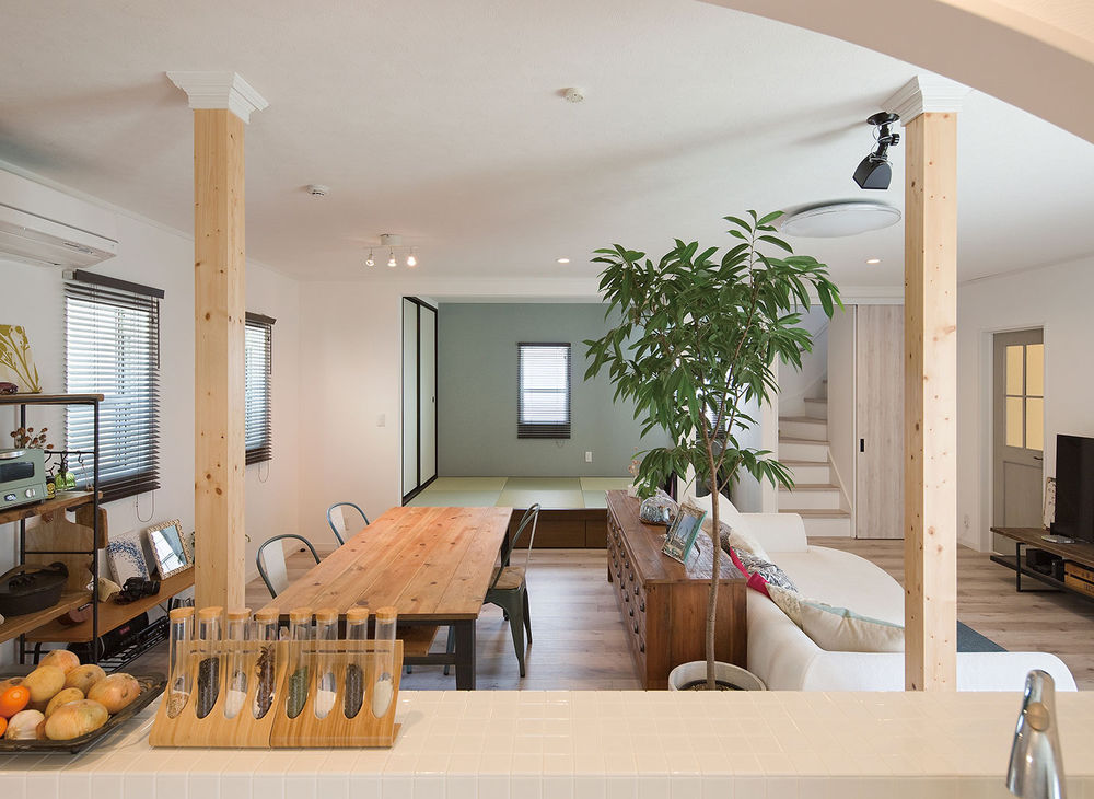「和室はなくてもいいけど、畳の上でくつろぎたい」という、要望をかなえるため、リビングの一角に畳の小上がりを設けたり、間仕切りに格子のデザインを採用したり、「和」を感じるアイテムで、くつろぎと和みの空間を提案。また、日本の伝統的な図柄のクロスや陶器のタイルを壁にあしらうなど、洋風の中に「和」のテイストをプラスすることで、モダンでおしゃれな演出を楽しむことができる。