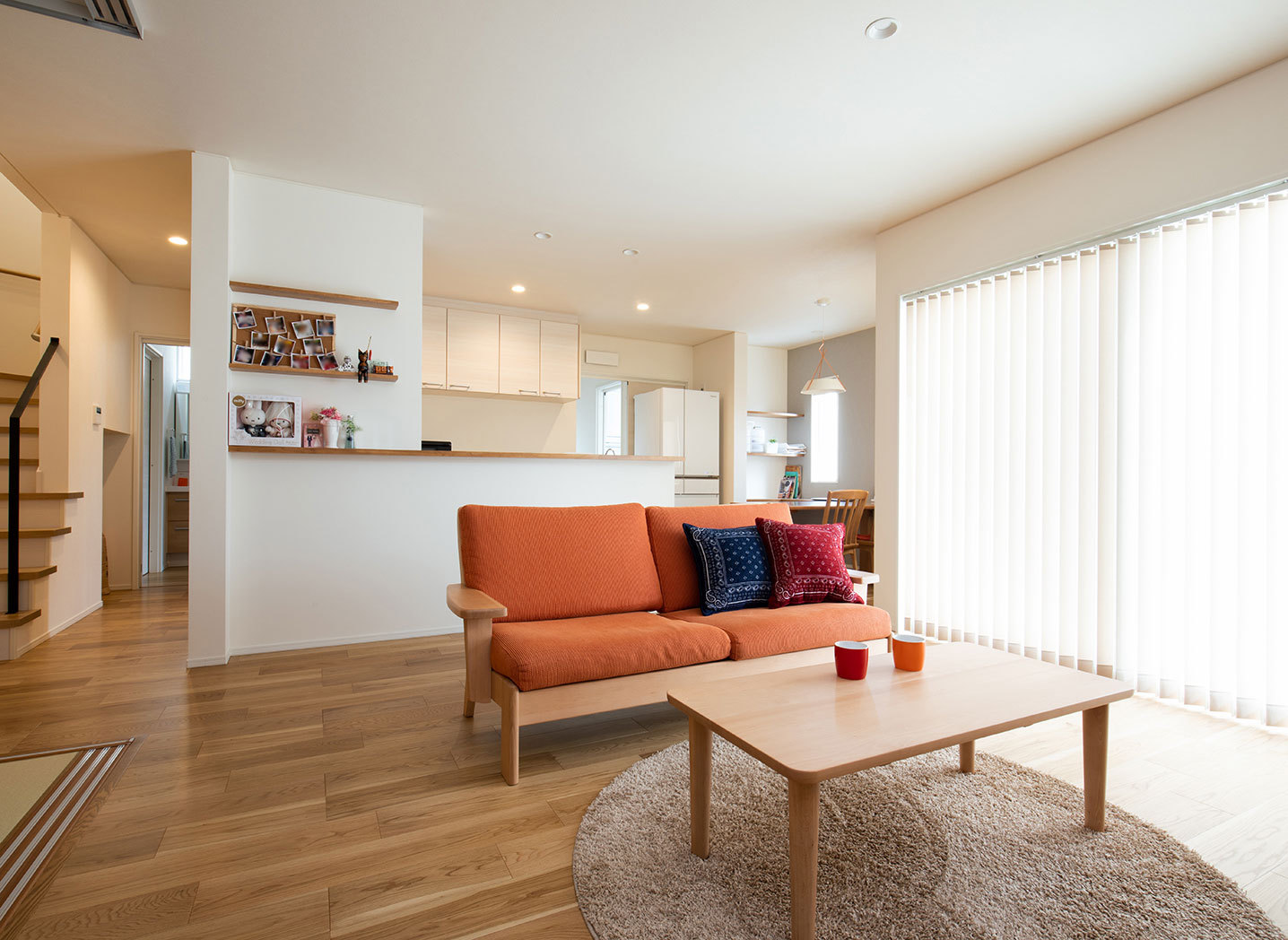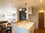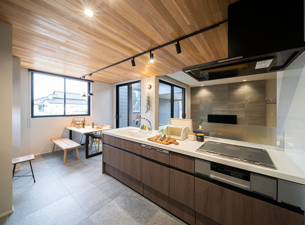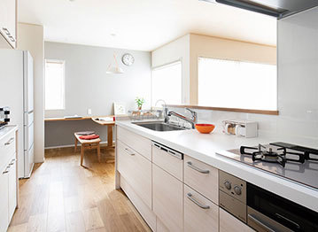 家事のために慌ただしく過ごす時間を軽減したいという希望を、高い設計力で叶えてくれる同社。例えば、玄関からキッチン、洗面所、サンルームに続くレイアウトで、買った物をすぐ冷蔵庫に収納できたり、洗濯物を効率よく干せる家事動線にしたり。またキッチンとダイニングを一直線にして調理、配膳、後片付けがラクに行えるなど、『いつものこと』がスムーズに行える。機能的で使い勝手のいい住まいづくりは、同社におまかせ。
