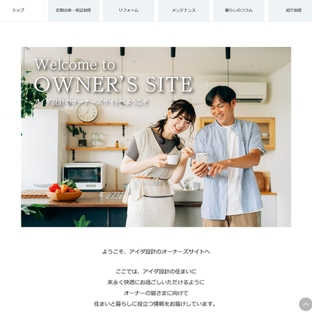 「アイダ設計の住まいで、末永く快適にお過ごしいただきたい」という想いから、既契約者向けサービスとして『オーナーズサイト』を発足。会員登録や年会費等は不要、住まいのメンテナンス方法、イベント情報、家で過ごす時間を充実させるお役立ち情報の配信だけでなく、既契約者にとって気になる、築年数やライフスタイルの変化に応じたリフォームや保証制度のご案内、実際の施工事例を閲覧することができる。