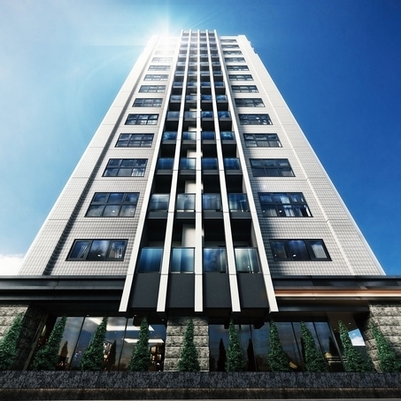 〈ファインシティアイム札幌琴似駅前〉外観。端正な意匠のエントランスアプローチ、植栽など街と調和したデザイン。JR琴似駅前のランドマークに相応しい風格(分譲済)※完成予想図につき実際とは多少異なる