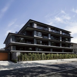 〈ザ・京都レジデンス御所東〉外観。2019年度グッドデザイン賞受賞。木々の映り込みが御苑の緑道との連続性を演出。東側の寺町通に連なる寺院の築地塀や山門に倣い、築地塀と開かれた車寄せを構える(分譲済)