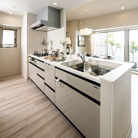 キッチンも「ここにまな板を置いて、包丁で材料を切って…」と暮らしをイメージし設計/キッチン(グラディス大分駅前)(分譲済)