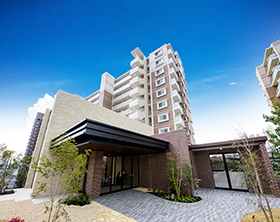 大規模商業施設へ徒歩5分。低層別棟のエントランスで高級感を演出