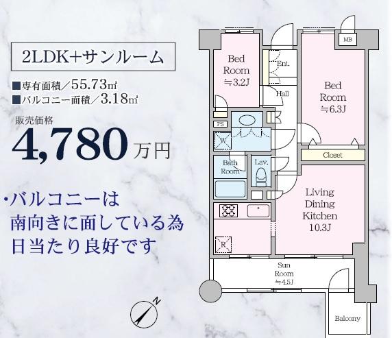 2LDK | 4580万円 | 55.73平米(壁芯) | 南東 | 即引渡可 | お問い合わせする(無料) SUUMOで詳細を見る |