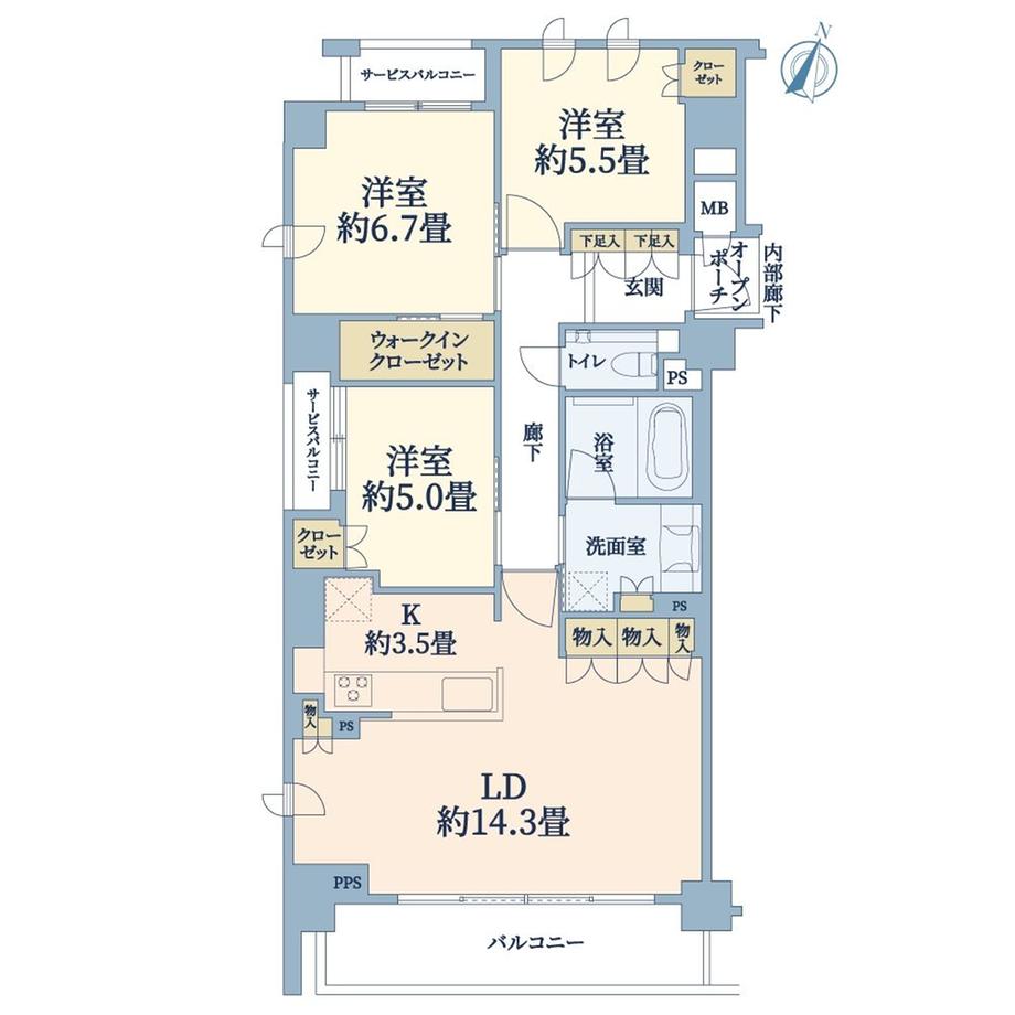 3LDK | 7480万円 | 83.98平米(25.40坪)(壁芯) | 南 | 2026年6月予定 | お問い合わせする(無料) SUUMOで詳細を見る |