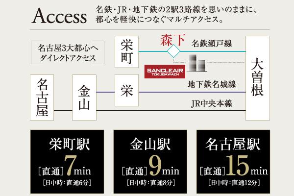 名鉄・JR・地下鉄と2駅3路線を自由に使えて、「栄」「金山」「名古屋」と3大都心へ直結するアクセスの良さに加えて、JR「大曽根」駅まで徒歩10分、地下鉄名城線「大曽根」駅まで徒歩12分、名鉄瀬戸線「森下」駅までは徒歩3分と、駅までの距離が近いのも交通利便性の幅を広げてくれている。