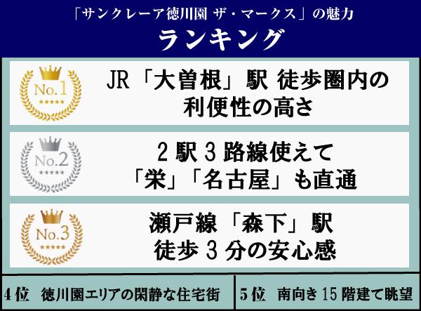入居者アンケートによると、「サンクレーア徳川園ザ・マークス」の魅力ランキングの1位~3位までアクセスに関係した内容となっていることがわかった。