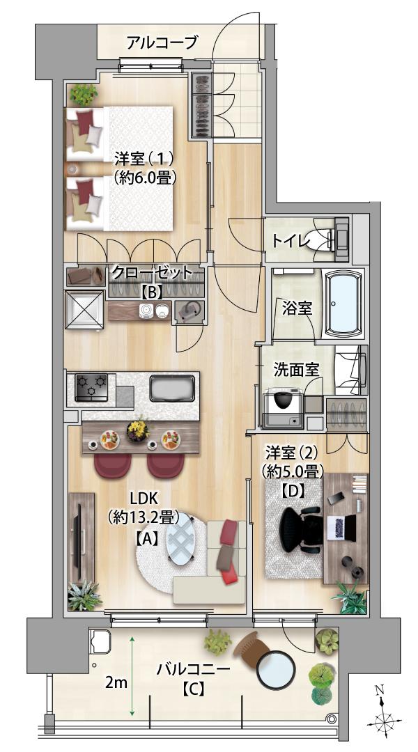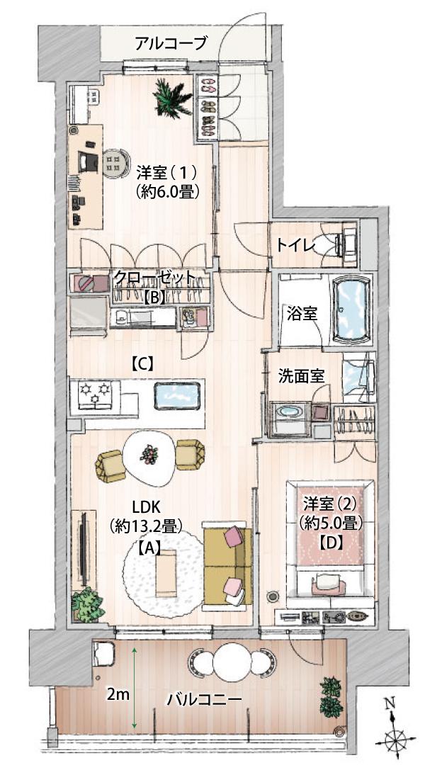 B2タイプ 2LDK 専有面積/54.17m2 バルコニー面積/10.75m2 アルコーブ面積/2.80m2