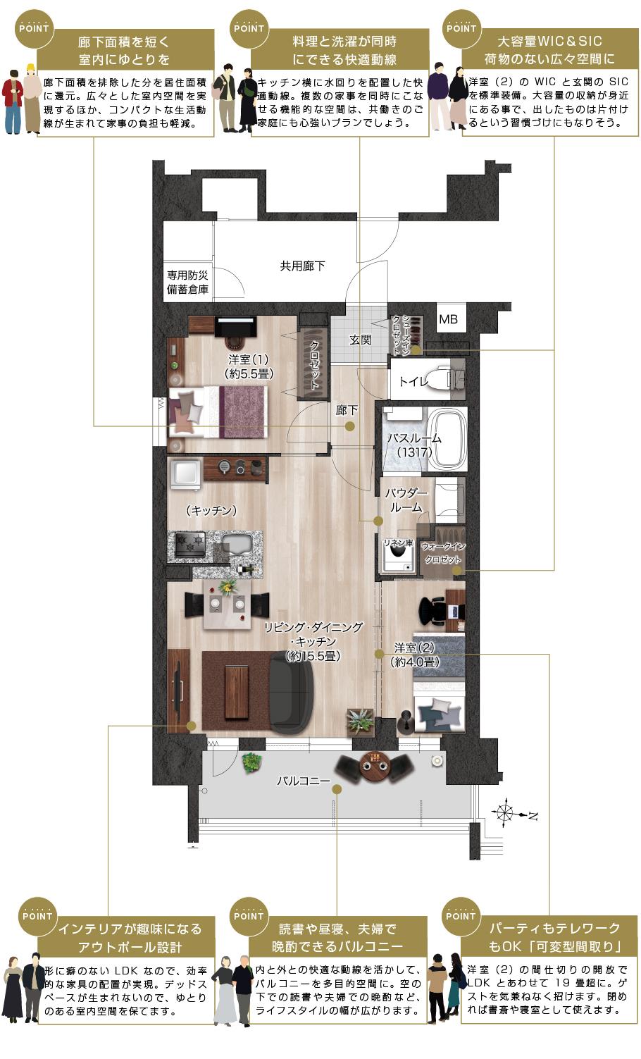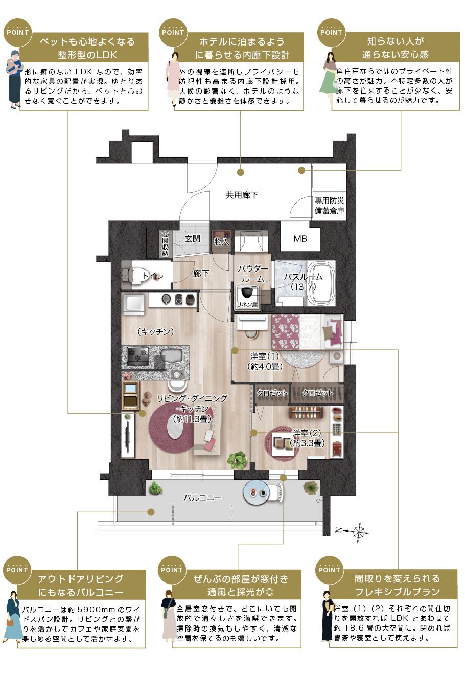 このニーズの答えとなりえるのが「Cタイプ」です。約5900mmのワイドスパンバルコニーに整形型LDKを隣接させることで、専有面積以上の広がりを体感できます。また、洋室(2)の間仕切りの開放でLDKとあわせて約14.6畳の広々空間に、閉めれば洋室(2)を書斎で利用可。住まいの将来性と暮らしやすさの両面を叶えるでしょう。