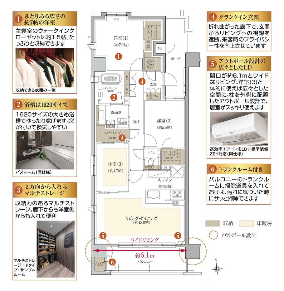 専有面積80.98m2、3LDK+2WIC+SIC+マルチストレージ+TR、南東角住戸、収納率12.8%
