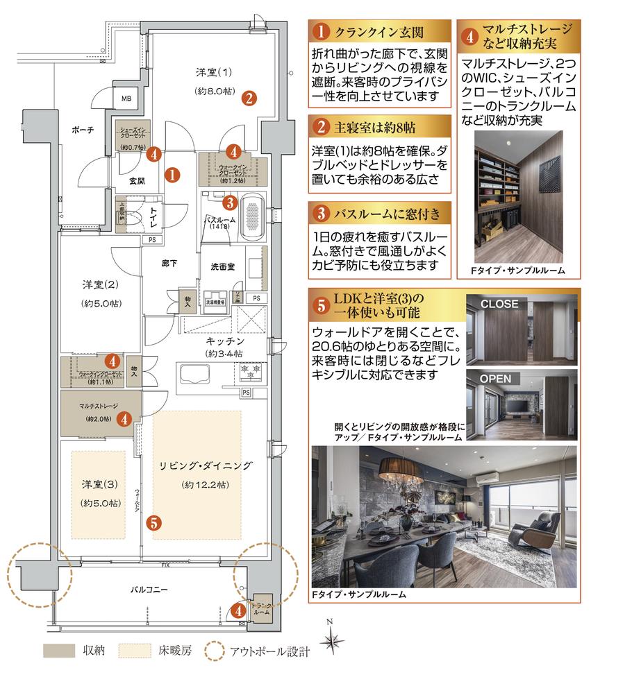 Fタイプはリビング・ダイニングにやわらかな陽光が差し込む、心地よい住まいです。リビング・ダイニングと洋室(3)を仕切るウォールドアを開ければ、開放感あふれる大空間として利用できます。収納スペースも充実しており、約2帖のマルチストレージには趣味の道具や大きな旅行バッグなどを置いておけます。