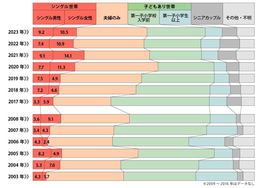 マンション契約者のライフステージを見ると、シングル世帯は年々増加傾向です