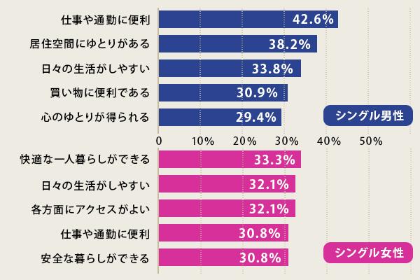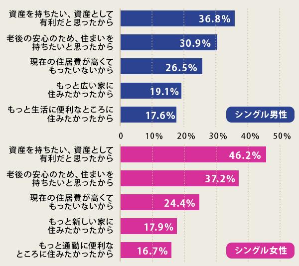 先述の通り、マンション契約者の64.8%は20~30代。また、住まいの購入理由には「結婚や出産」「社宅や寮を出る必要があった」「家賃が高いと感じた」など様々です。そんな中でもシングル世帯の購入理由に絞って見ると、男女問わず「資産を持ちたい」「老後の安心のため」が1位・2位に挙がっており、特に女性の方がその傾向が強いことが分かります。「現在の住居費が高くてもったいないから」という理由も合わせると、払うだけの家賃より将来への自己投資という観点で人生設計の一環としてマンション購入を決断している人が多いことも考えられます。