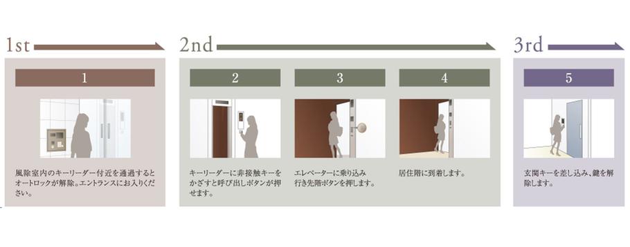 各住戸だけでなく共用部にも先進システムが充実。例えば、風除室、エレベーター、住戸玄関の3カ所でチェックしてくれるトリプルセキュリティシステムを導入しています。非接触キーを用いた照合機能を採用し、キーをカバンなどから出さずにオートロックドアを解錠できるので、セキュリティ面と利便性を兼ね備えています。