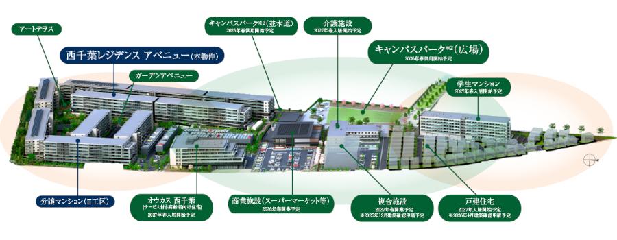 ※2:商業施設・「(仮称)西千葉キャンパスパーク」は2026年春開業・供用開始予定。学生マンション・サービス付高齢者向け住宅・介護施設・複合施設は2027年春入居開始・開業予定。戸建エリアは2027年入居開始予定。分譲マンション(II工区)は入居時期未定。「(仮称)西千葉キャンパスパーク」「コミュニティカフェ」は居住者専用の施設ではありません。運用開始時期については変更となる可能性がございます。居住者以外の第三者も利用します。また施設の運営は将来にわたって保証されるものではありません。ご利用の際は管理規約に従っていただきます。