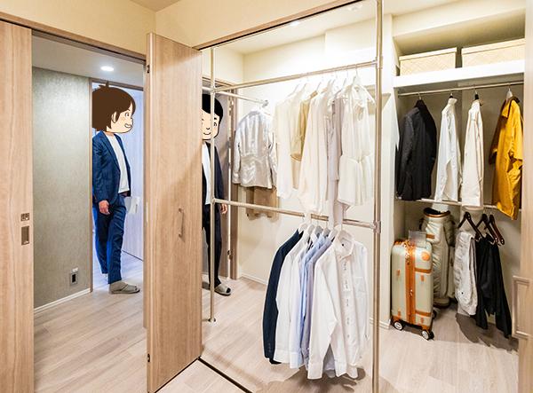 すまいよみ「モデルルームの『フィットインクローゼット』は印象的でした。廊下側からも洋室側からも出入りできる2WAY動線で、写真の通り大容量。家族の春夏秋冬の衣服がすべて収まる広さがあります。デッドスペースになりがちな奥行きをうまく使えるよう、ハンガーパイプの配置も工夫されていました」