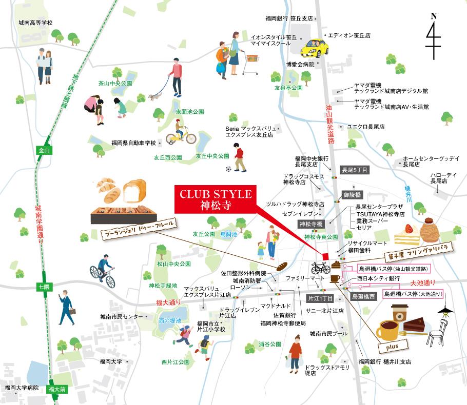 『油山観光道路』と『福大通り』。2つの大通りの交差点に近く、通り沿いには様々な生活利便施設が建ち並ぶ神松寺エリア。徒歩4分の「長尾センタープラザ」には、業務スーパー、TSUTAYA、Seria、セカンドストリート、ピザハットに加え、 フィットネススタジオやカラオケ店までワンストップで利用できます。24時間営業の「サニー北片江店」も徒歩4分の近さ。その他、コンビニやドラッグストア、ユニクロなど、日々の暮らしに欠かせない店舗がすべて徒歩圏に充実(※4)。さらに、 六本松方向へ徒歩17分の場所には、こだわりの品揃えで人気のイオンスタイル笹丘も!世代を問わず暮らしやすさを実感できる街といえるでしょう。