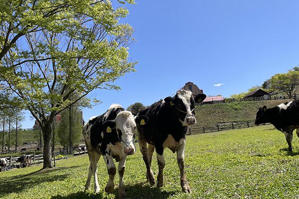広大な草地に放牧された牛を間近に見る「育成牧場」。乳しぼり体験もできます(有料)