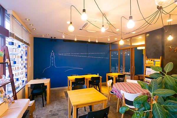 青い壁には店名にちなんだ灯台が描かれており、絵本の世界へ飛び込んだような雰囲気