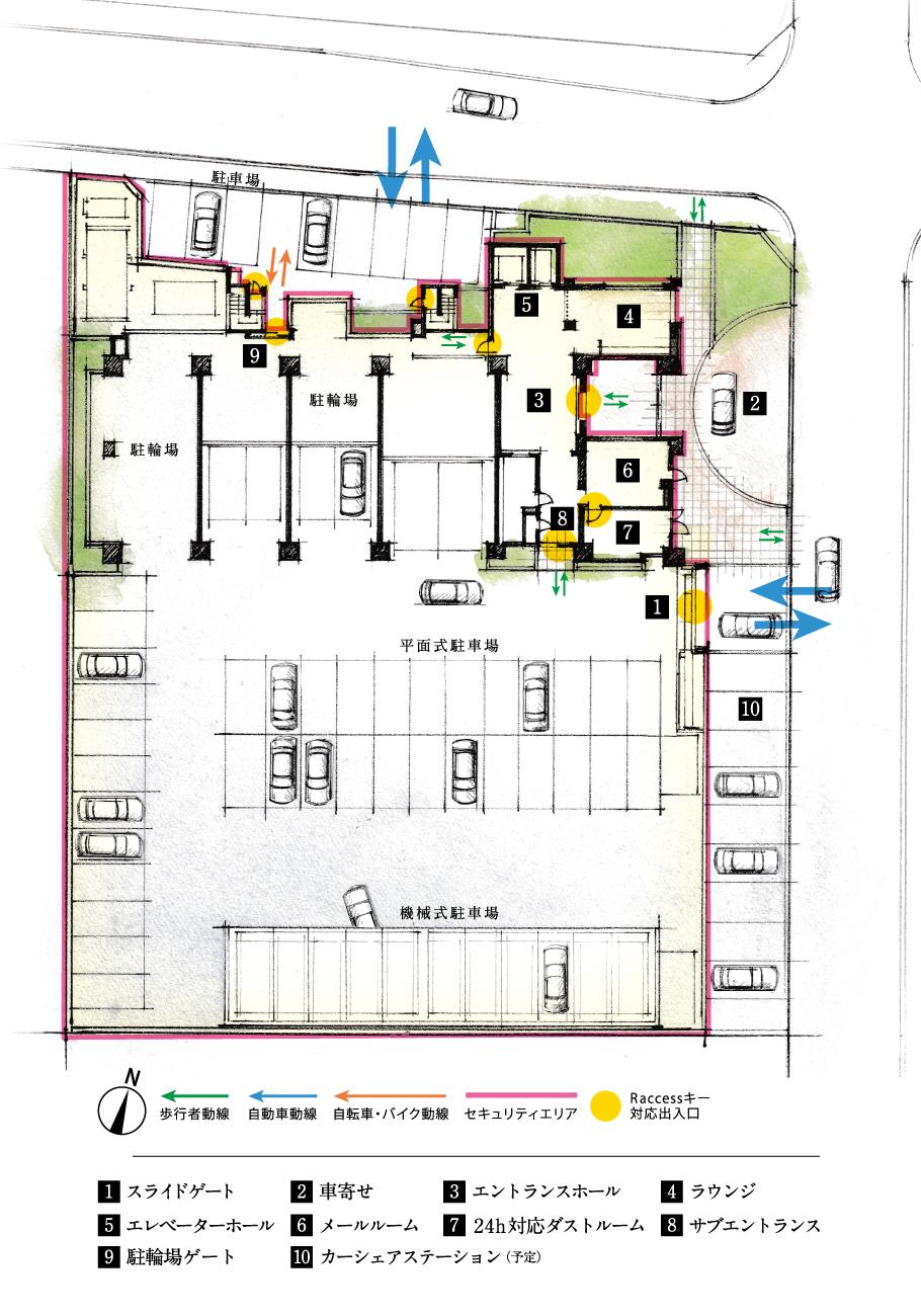 部外者の侵入を未然に防ぐゾーンセキュリティ採用(敷地配置図)