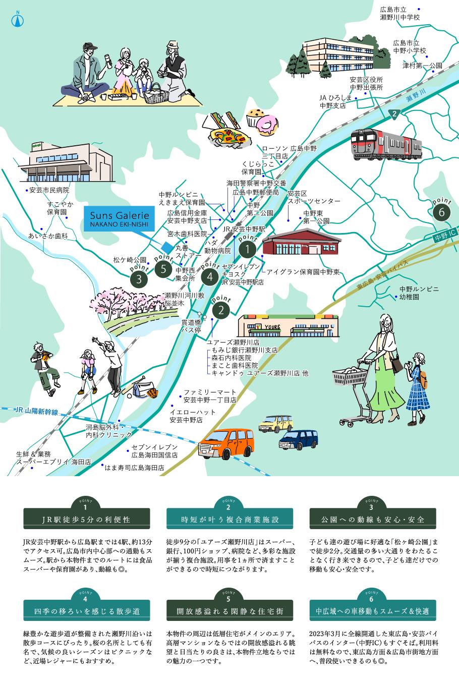駅近だけでなく、日常生活をストレスフリーで過ごせる、多彩な生活利便施設にも注目。子育て世帯には欠かせない保育園が徒歩圏内に4施設もあり、共働きも無理なく実現できるロケーションです。また、徒歩2分の最寄りスーパーマーケット(丸善ストアー)をはじめ、徒歩9分の「ユアーズ瀬野川店」には、銀行、100円ショップ、病院などが併設。用事を一ヵ所で済ませることができるので、時短につながります。内科や小児科など複数の診療科がある総合病院「安芸市民病院」や「安芸区スポーツセンター」など、安芸区の主要施設も近接。瀬野川沿いに整備された緑豊かな遊歩道や、大型遊具やキャンプ場などの施設を備えた「海田総合公園」もすぐそば。身近な自然を感じながら、のびのび子育てできる環境も魅力の一つです。