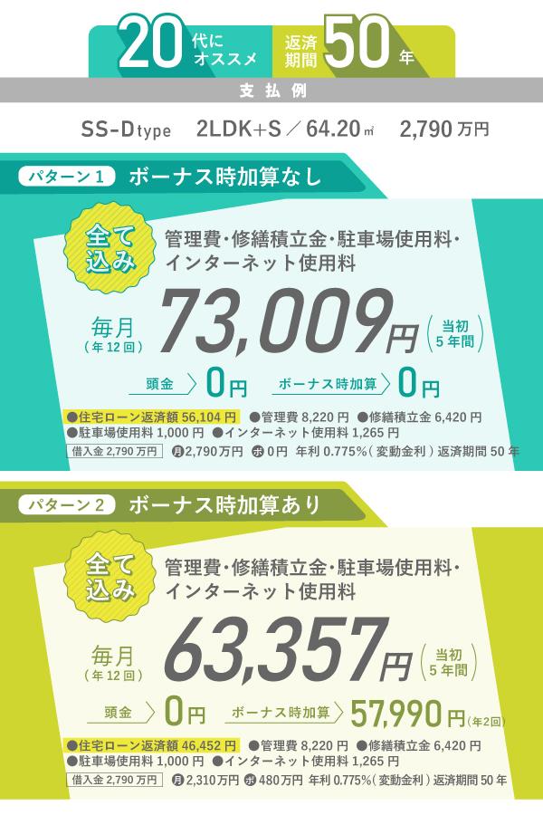 長期で返済することのメリットの一つは毎月の返済額が下がること。掲載の返済期間50年の支払例の場合、住宅ローン返済額は頭金0円・ボーナス時加算0円で、月々56,104円。返済期間35年と比べると差額は月額19,762円、年額だと約23万円も下がります。マンション購入後、月々の支払が必要な管理費・修繕積立金・駐車場使用料・インターネット使用料をすべて合計しても月々支払額は73,009円。