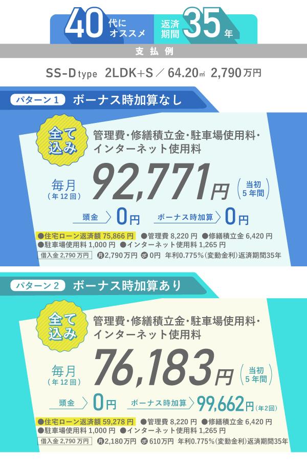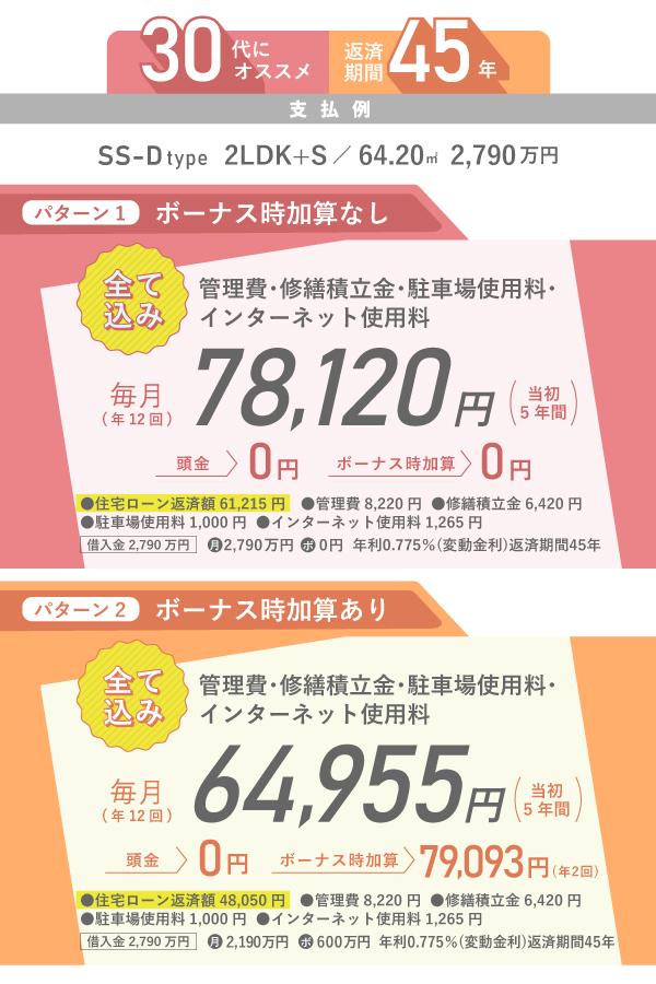 • 30代でも長期の住宅ローンを組むことが可能です。例えば34歳で返済期間45年の住宅ローンを組んだ場合、返済額は頭金0円・ボーナス時加算0円で、月々61,215円。マンション購入後、月々の支払が必要な管理費・修繕積立金・駐車場使用料・インターネット使用料をすべて合計しても月々支払額は78,120円。賃貸物件とは違い、購入物件は資産になるものですから、この価格でマンションを購入できるのは魅力的。月々の返済額をできるだけ抑えたい方は、住宅ローンの完済時年齢を意識しながら、検討を進めることが重要です。
