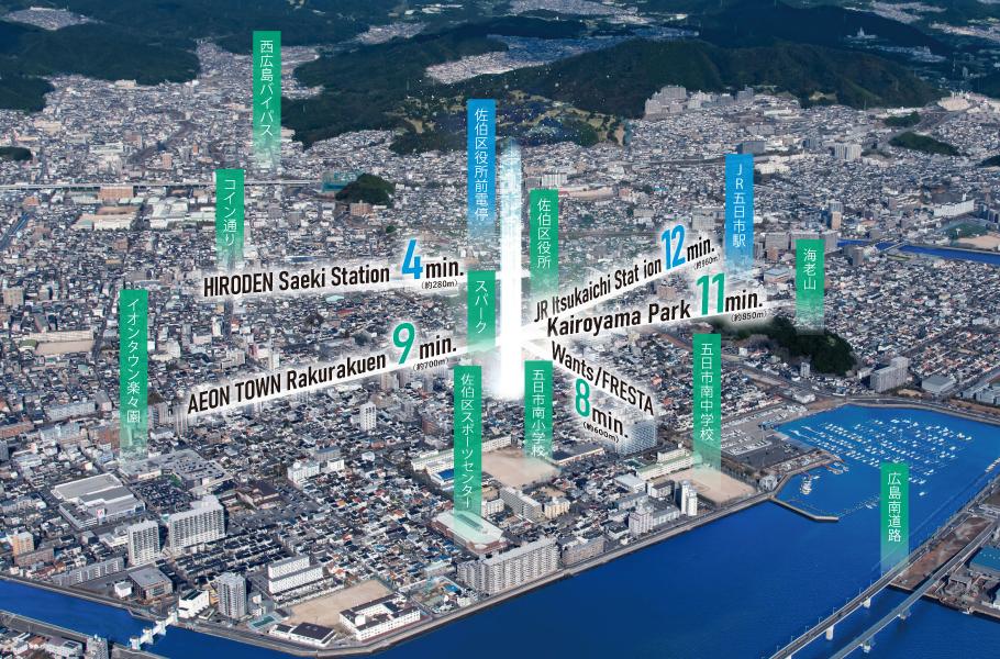 ここは、交通利便&生活利便のどちらにも優れた好立地。JR五日市駅1km圏内での新築分譲マンションの供給は約5年ぶり(自社調べ)、JR沿線の注目物件です。
