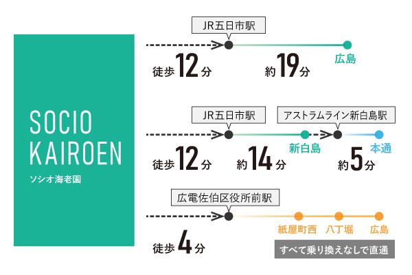 JR五日市駅と大型商業施設「イオンタウン楽々園」、その両方が1km圏内で、無理なく利用できる理想的な住環境にソシオシリーズの新築分譲マンション誕生。